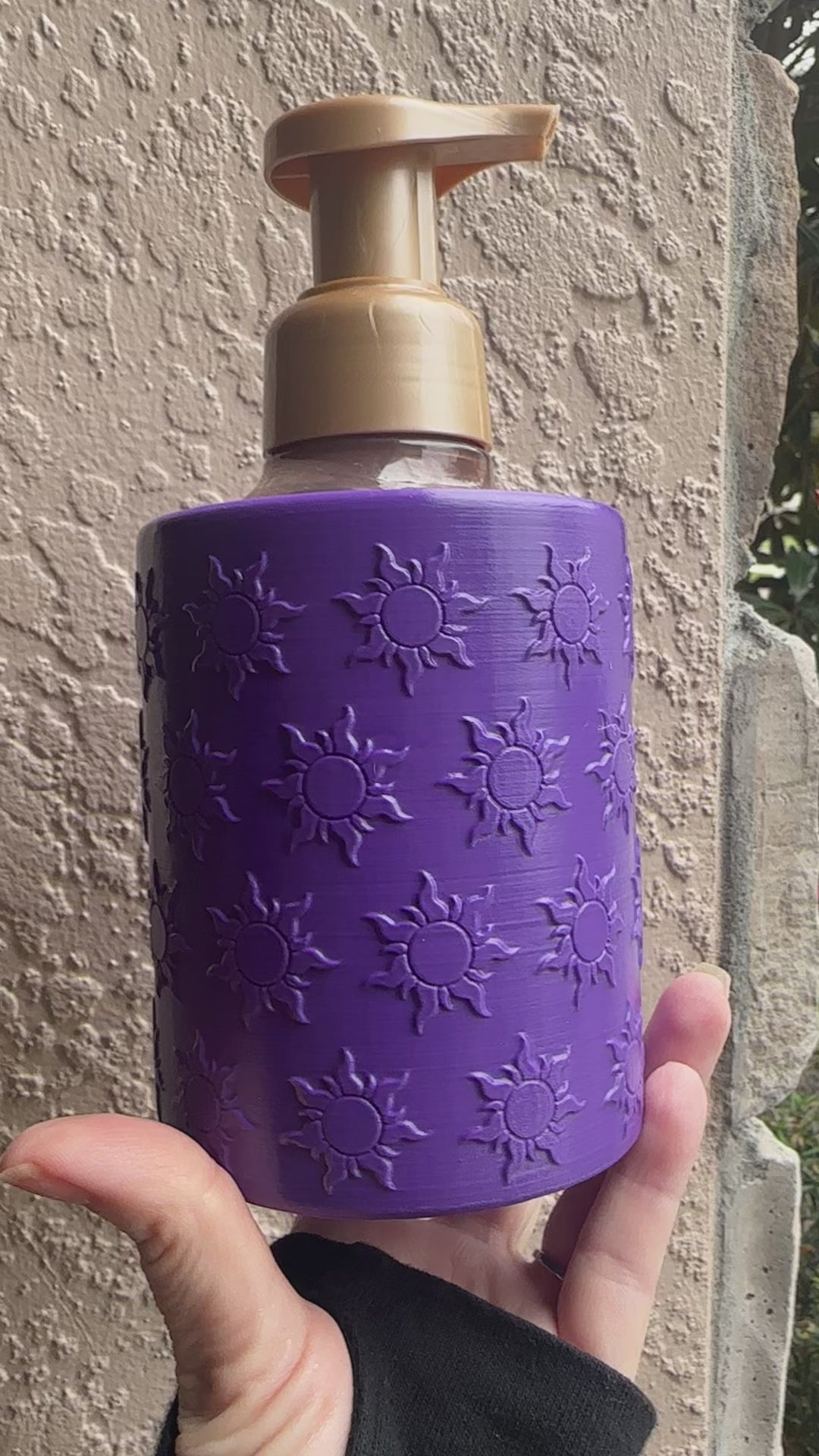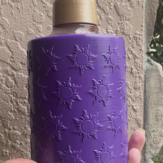 Bring a touch of fairytale magic to your sink with this enchanting Tangled Sun–Inspired Foaming Soap Holder, designed to fit standard Bath & Body Works foaming soap bottles. Measuring 4 1/2" tall with a 4" diameter, this stunning holder features a rich purple finish wrapped in raised sun motifs inspired by the glowing emblems from Tangled.